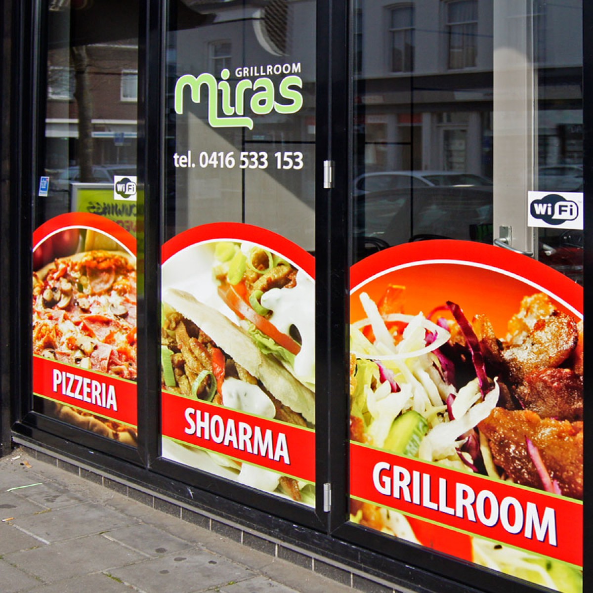 Voor Miras in Waalwijk heeft Epulz reclame de belettering van de ramen, auto en prijslijst borden verzorgd.